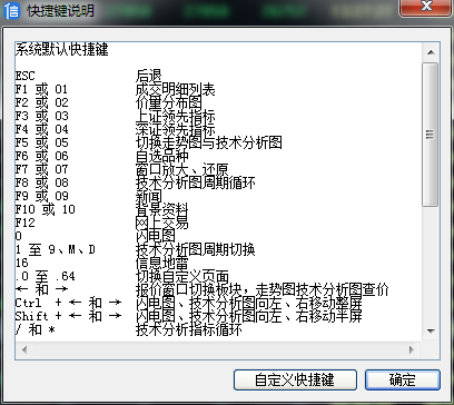 信管家常用快捷键,可以帮您快速的切换到所要使用的选项。 ESC 后退 F1 或 01 成交明细列表 F2 或 02 价量分布图 F3 或 03 上证领先指标 F4 或 04 深证领先指标 F5 或 05 切换走势图与技术分析图 F6 或 06 自选品种 F7 或 07 窗口放大、还原 F8 或 08 技术分